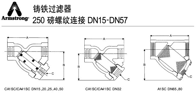 阿姆斯壮Y型过滤器是在管道系统中用于过滤颗粒物质。对于一个良好设计系统的有效运转而言,过滤器起着重要作用。阿姆斯壮Y型过滤器由铸铁、碳钢、铬钼、锻钢、不锈钢、青铜等制造。利用螺纹、承插焊或法兰来连接,阿姆斯壮T型过滤器由不锈钢制造。